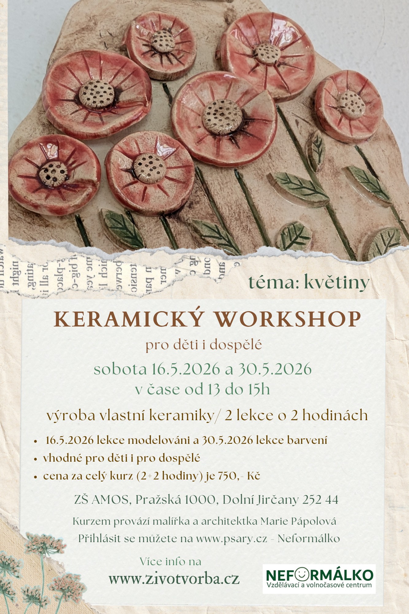 Zveme Vás na keramický workshop. Během kurzu si můžete vyzkoušet práci s keramickou hlínou, můžete si vymodelovat vlastní výrobky nebo se nechat vést konkrétním zadáním. Každý účastník má k dispozici materiál, ze kterého pohodlně vymodeluje dva až tři keramické výrobky. Workshop se skládá ze dvou sobotních lekcí (2+2 hod.). Na první lekci výrobky modelujeme, na druhé lekci je nabarvíme glazurami. Workshop probíhá v příjemné atmosféře pod vedením malířky a architektky v krásných moderních prostorech základní školy AMOS.